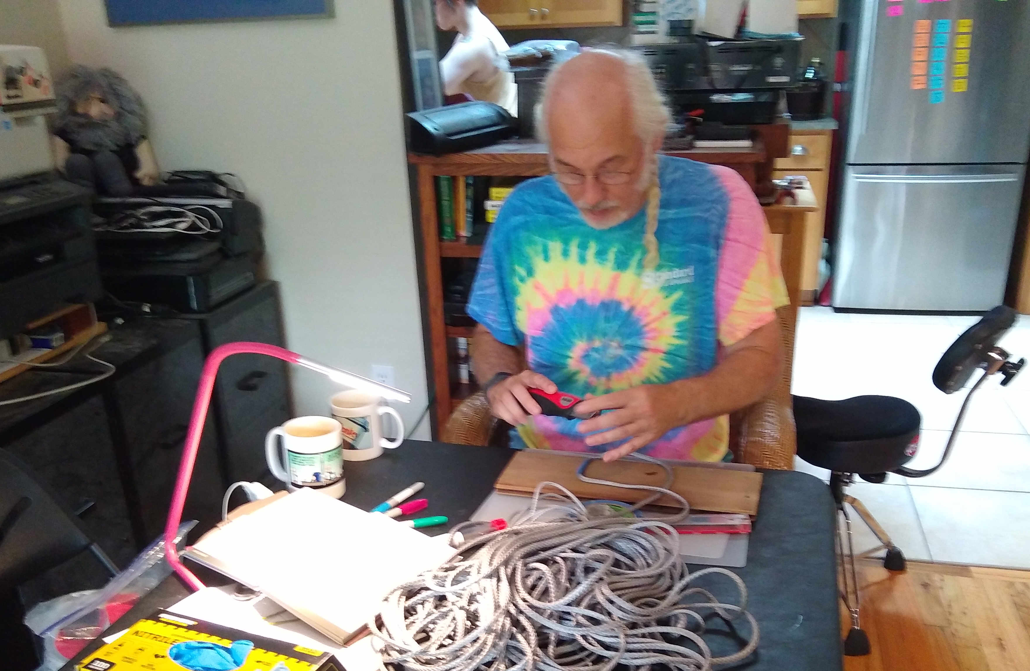 | Preparations for going back to sea continue. Jerry watches as I practice eye splices on the new lazy jacks. This single-braid dyneema is MUCH easier to splice than our new double-braid halyards. Our kanban board has a remote annex on the land fridge.